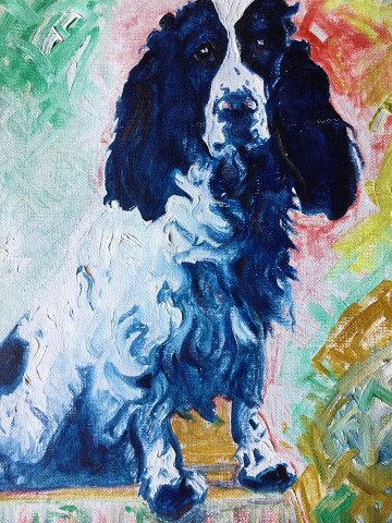 Siddende hund i interiør 1955 - antagelig en "Kleiner Münsterländer."