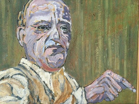 Torben Heron (1939-2019): Portræt af Tyran med okkerfarvet skjorte 1973. Olie på lærred. Sign.: Torben Heron 1972-73 (bagpå lærred) 50x61 (52x63)