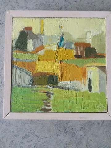 Birthe Kjærsgård (født 1949): Kompositioner med bygninger Olie på plade. Sign.: BK Hvert enkelt maleri måler 15x15 (17x17)