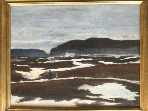 Johannes Dührkop (1903-85): Vinterparti fra Asminderød 1943. Olie på lærred. Sign.: JD (monogram) - 43. Bagpå rester af udstillingsmærkat nr. 4. Lækker guldramme. 55x69 (64x79)