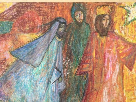Erna Gonge (død 2009): De Hellige Trekonger. Pastel/oliekridt på papir. Sign.: E. Gonge Passepartout er snavset, men pastellen fin. 43x62 (52x71)