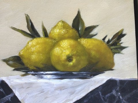 Denis Virlogeux (født 1948): Opstilling med citroner på fad. Olie på lærred. Sign.: Virlogeux 30x30 (34x34)