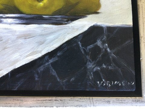 Denis Virlogeux (født 1948): Opstilling med citroner på fad. Olie på lærred. Sign.: Virlogeux 30x30 (34x34)