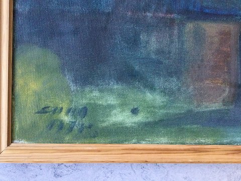 Svend Aage Tauscher (1911-82): Byparti med kirke 1975. Bagpå betegnet "Justorum Animae Dei" Anno 1975. Frit oversat "Guds retfærdige sjæl" Olie på lærred. Sign.: SAAT 1975. 46x55 (51x61)