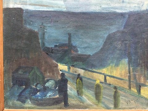 Svend Aage Tauscher (1911-82): Byparti med personer 1947. Olie på lærred. Sign.: Tauscher 1947. 44x50 (49x55)