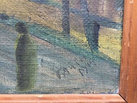 Svend Aage Tauscher (1911-82): Byparti med personer 1947. Olie på lærred. Sign.: Tauscher 1947. 44x50 (49x55)