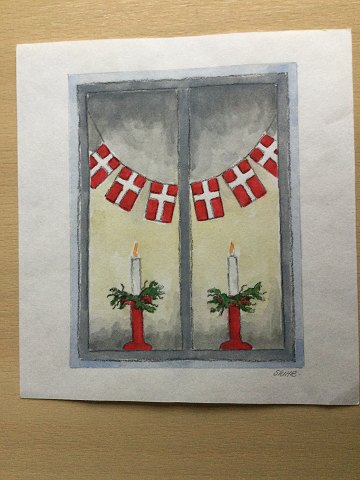 Erik Stuhr (1936-2014): Vindue med julelys og Dannebrogsguirlande. Akvarel på papir. Sign.: Stuhr Uden ramme. 14x13
