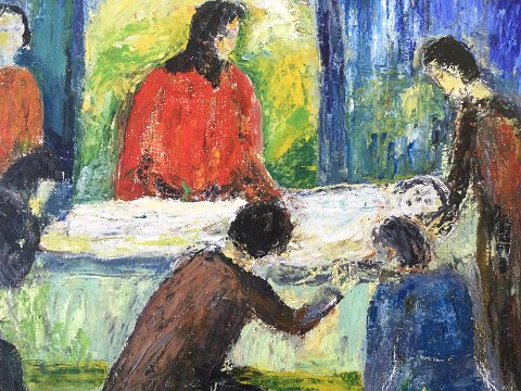 Jens Nielsen (1891-1978): Lazarus' opvækkelse 1945. Sign.: Jens Olie på lærred. Bagpå stempel 10/1 1945, Stockholm 19/1 1946 samt Udstilling i Kunstnernes Hus i Oslo 1957 nr. 25. 71x85 (87x101)