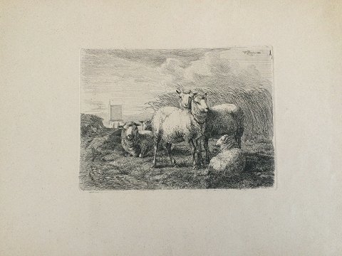Johannes Vilhelm Zillen (1824-70): Får på marken 1860 Radering på papir. Sign.: W. Zillen 1860 (i trykket) Uden ramme. Bladet måler 27x34 - beskåret (trykfladen 13½ x 18) 21622