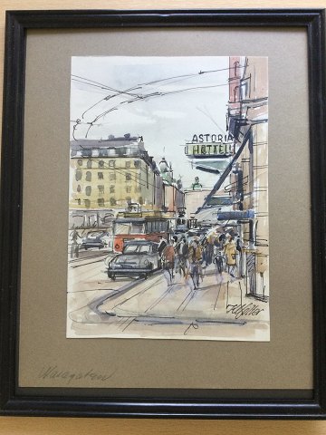 Kai Molter (1903-77): Hotell Astoria, Vasagatan 10 i Stockholm. Tusch og akvarel på papir monteret på brunt papir. Sign.: K. Molter Indrammet i sort plastic ramme. 18x13 (26x21) 23322