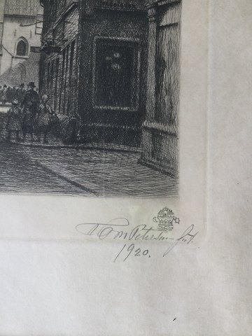 Peter Tom-Petersen (1861-1926): Algade, Aalborg med Budolfi Kirke 1920. Radering på papir. Sign.: P. Tom Petersen 1920 (bly) Nr. 10 I trykket - Aalborg Byvåben 29½x21½ (45x38) 46521