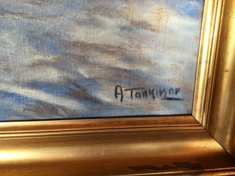 Axel Tankmar (1880-1960): Vinterlandskab med personer på vej Olie på lærred. Lille hul i lærred (se foto) Sign.: A. Tankmar 61x94 (76x109) 35604