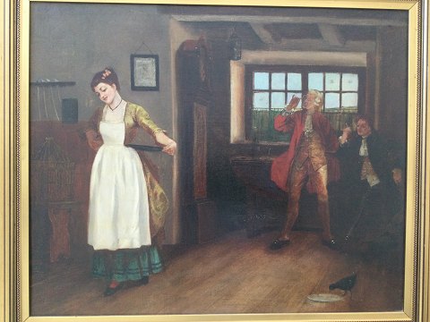 Jules Rousset (1840-1921): Værtshusscene fra rokokotiden. Olie på lærred. Sign.: Rousset 94. Lille reparation (se foto) Bagpå - stempel fra London. 45x55 (60x70) 28422