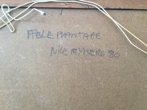 Nils Ryberg (født 1946): Æbleplantage 1980. Olie på masonitplade. Sign.: N19 6/1 80R. Bagpå plade - Nils Ryberg 80 - Æbleplantage. Indrammet i ældre ramme med afslag. 27x39 (39x51) 30622
