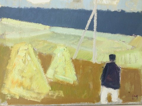 Leon Møller (1919-92): Høstakke, personer og telefonmast i landskab. Olie på lærred. Sign.: LM. Bagpå - Leon Møller 31x41 (45x55) 33022