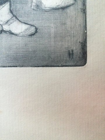 Herman Stilling (1925-96): Siddende kvinde med håndarbejde 1956. Radering på papir. Sign.: H (i trykket) 36x27 (39x30)