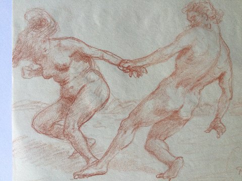 Robert Büchtger (1862-1951): Nøgen kvinde og mand "leger". Rødkridt på papir. Sign.: R.B. Uden ramme. Bladet måler 16½ x 22 32322