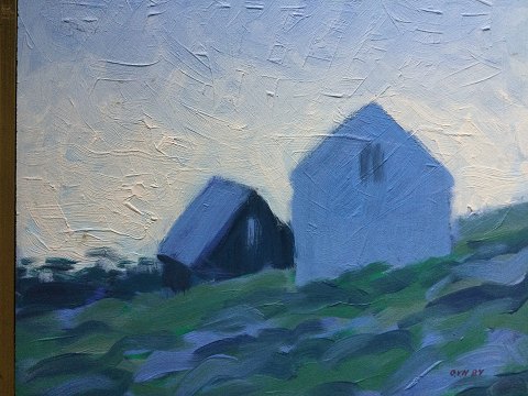 Ole Vang Hansen (1924-97): Landskab med huse fra Færørene 1984. Olie på plade. Sign.: O.V.H. 84. 25x30 (27x32)