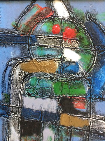 Jens Horup (20 årh): Abstraktion med person. Emalje på plade. Sign.: J. Horup 51x41 (54x44)