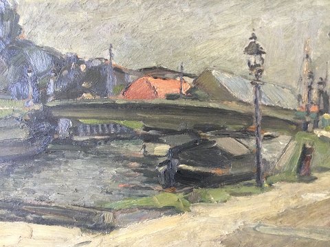 Bagpå label fra Udstilling hvor maleriet tilhørte Fru Magda Isbrand.