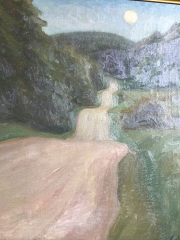 Søren Josva Christensen (1892-1948): Vej gennem bakket skovområde i måneskin. Olie på lærred. Sign.: JOSVA 58x61 (71x74)