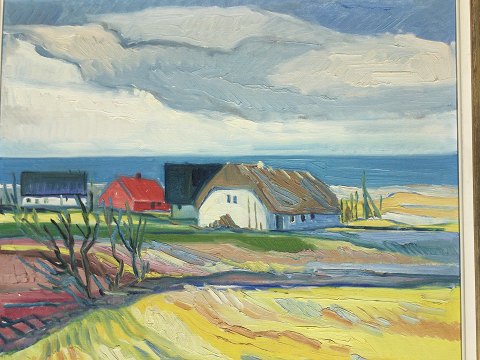 Aage Strand (1910-75): Kystparti med gårde. Olie på lærred. Sign.: AS 52x63 (62x72) Åge Strand