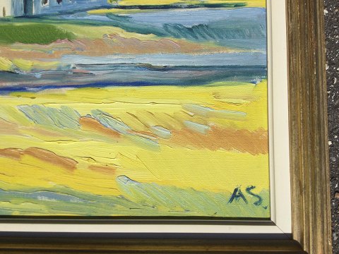 Aage Strand (1910-75): Kystparti med gårde. Olie på lærred. Sign.: AS 52x63 (62x72) Åge Strand
