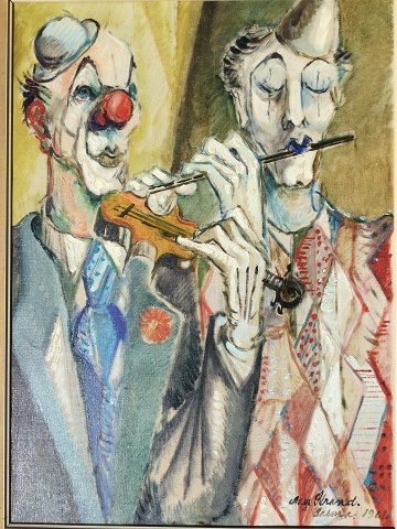 Aage Strand (1910-75): 2 musicerende klovne - Palma 1961. Olie på lærred. Sign.: Aage Strand Palma 1961. 75x55 (86x66) Åge Strand
