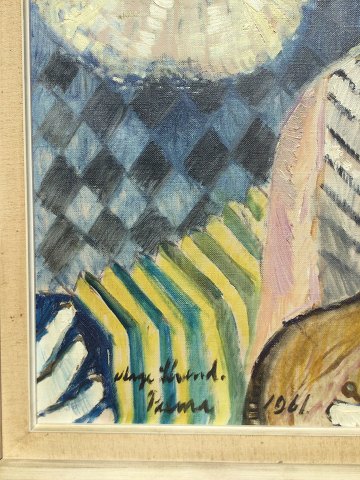 Aage Strand (1910-75): 2 musicerende klovne, Palma 1961 Olie på lærred. Sign.: Aage Strand Betegnet - Palma 1961 74x54 (83x63) Åge Strand
