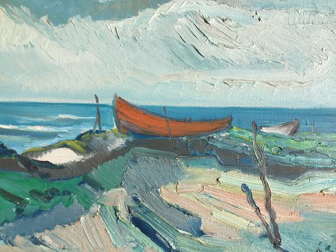 Aage Strand (1910-75): Både på stranden. Olie på lærred. Sign.: ÅS 40x50 (56x62) Åge Strand