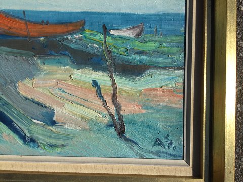 Aage Strand (1910-75): Både på stranden. Olie på lærred. Sign.: ÅS 40x50 (56x62) Åge Strand