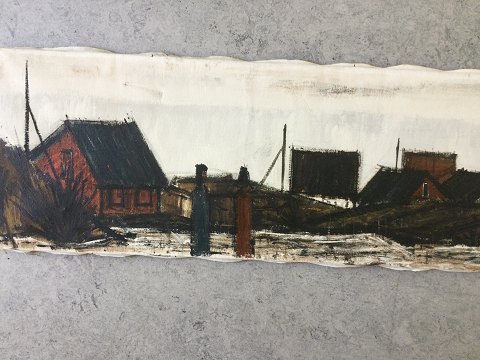 Peder Brøndum Sørensen (1931-2001): "Figurer og huse ved havet" 1972. Olie på lærred. Sign.: PBS Bagpå - Peder Brøndum Sørensen 72 samt "Figurer og huse ved Havet" Uden ramme. 30x100 15023