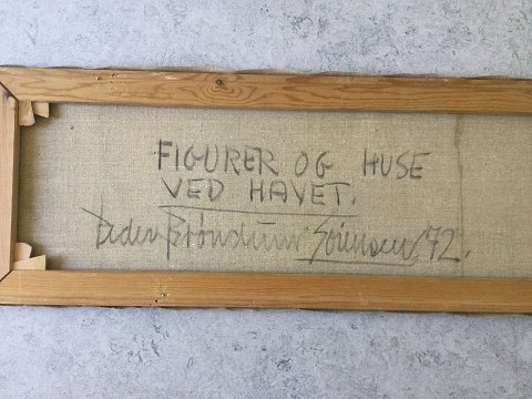 Peder Brøndum Sørensen (1931-2001): "Figurer og huse ved havet" 1972. Olie på lærred. Sign.: PBS Bagpå - Peder Brøndum Sørensen 72 samt "Figurer og huse ved Havet" Uden ramme. 30x100 15023