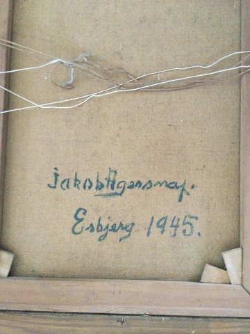 Jakob Agersnap (1888-1958): Siddende, ældre kvinde i interiør 1945. Olie på lærred, Sign.: Jakob Agersnap Bagpå lærred - Jakob Agersnap Esbjerg 1945. 55x41 (65x51) 9312