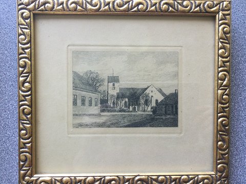 Axel Holm (1861-1935): Byparti med kirke. Radering på papir. Sign.: Axel Holm ( i trykket) 21x24 (24x27)