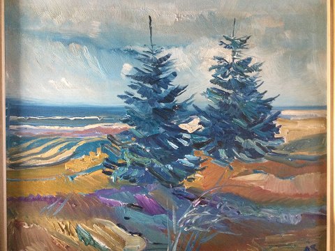 Aage Strand (1910-75): Graner i klitlandskab. Olie på lærred. Sign.: ÅS 60x70 (75x85) Åge Strand