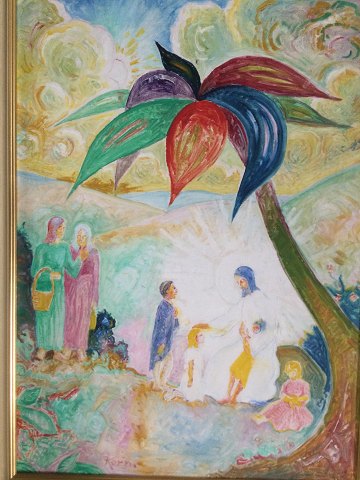 Hans Jørgen Korn (1888-1963): Jesus og "Lad de små børn komme til mig" Olie på lærred. Sign.: Korn. 66x48 (72x57)