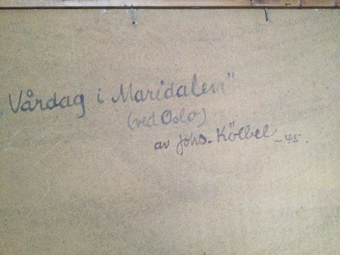 Johannes Kølbel (1883-1983): Vårdag i Maridalen ved Oslo, Norge. Olie på plade. Sign.: Johs. Kölbel 45. Bagpå plade - Vårdag i Maridalen ved Oslo av Johs. Kölbel - 45. 80x100 (96x116)