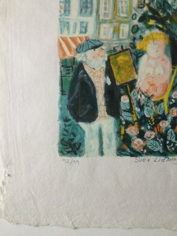 Sven Lidberg (1929-2009): Fransk kunstner ved sit staffeli og med nøgenmodel. Farvelitografi på håndgjort papir. Sign.: Sven Lidberg Nummer 93/99 55x38 (69x52)