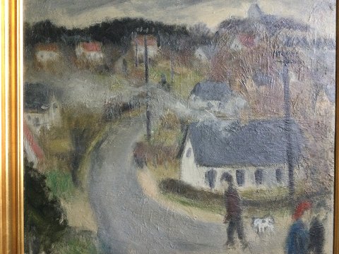 Marie Vandmose (1913-93): Personer på vej gennem by. Olie på plade. Signeret bagpå - Marie Vandmose. 58x67 (66x75) Marie Vandmose var gift med kunstmaleren Knud Vandmose Larsen (1912-83). 2324
