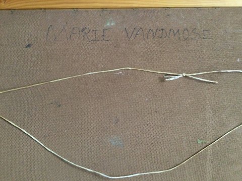 Marie Vandmose (1913-93): Personer på vej gennem by. Olie på plade. Signeret bagpå - Marie Vandmose. 58x67 (66x75) Marie Vandmose var gift med kunstmaleren Knud Vandmose Larsen (1912-83). 2324