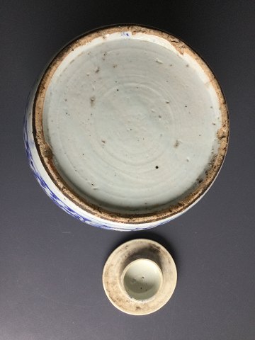 Gammel kinesisk urne/bojan med låg. Blå dekoration med lykke symboler. Tung Chih perioden (1862-75). Højde med låg 22 cm. Diameter i bund 22 cm. 5124