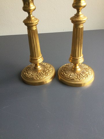 Par forgyldte messing stager. Empireform omkring år 1900. Støbt med mønster på hvælvede fodstykker samt profilerede stammer mm. Højde - 23 cm.