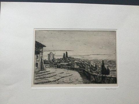 Johan Rohde (1856-1935): Udsigt ind over Rom fra Gianicolo 1934. Radering på papir. Sign.: JR i trykket og Johan Rohde i bly DDRF 1934. Pladens mål 15x22 - Bladets mål 30x40 13224