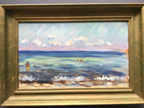Svend Aage Rendboe (1929-87): Sommerdag ved Nyborg Strand. Udstillingslabel bagpå - "Sommerdag ved Nyborg Strand" Olie på plade. Udstillingsnummer bagpå - 3. Sign.: Rendboe. 28x45 (37x55) 15724