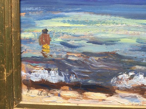 Svend Aage Rendboe (1929-87): Sommerdag ved Nyborg Strand. Udstillingslabel bagpå - "Sommerdag ved Nyborg Strand" Olie på plade. Udstillingsnummer bagpå - 3. Sign.: Rendboe. 28x45 (37x55) 15724