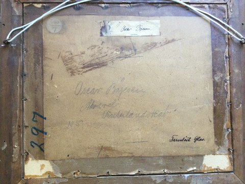 Bagpå - Oscar Bojesen samt udstillingsmærkat og stempel fra Winkel og Magnussen.