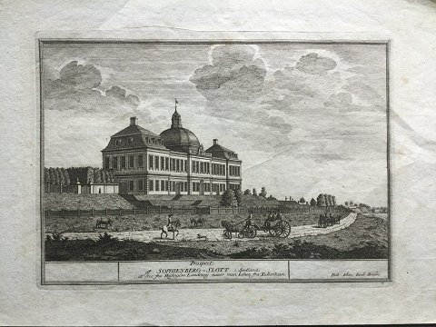Betegnet - Prospect af Sophienberg-Slott i Sædland at se fra Helsigörs Landevej naar man kommer fra Kiöbenhavn.