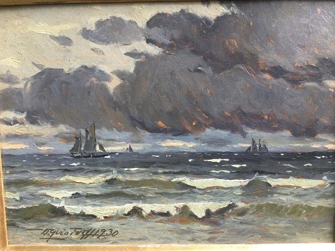 Victor Qvistorff (1882-1953): Sejlskibe ud for kysten ved Hornbæk 1930. Olie på plade. Sign.: V. Qvistorff 1930. 16x22 (22x28) 21224