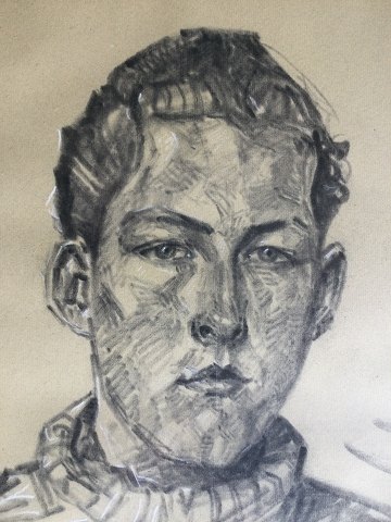 Hans Jørgen Korn (1888-1963): Portræt af smuk, ung mand 1955. Kul på papir. Sign.: Korn 55 - d. 23-4 58x42 (61x46) 21324